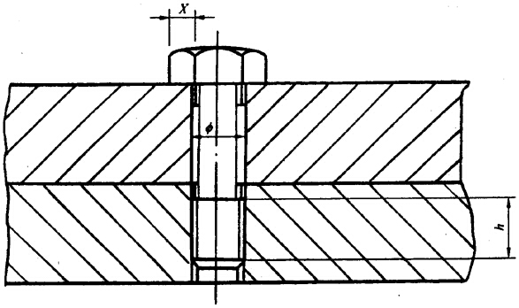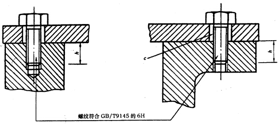 h≥緊固螺栓的螺紋外直徑 c≤ISO286-2的H13級允許最大間隙 圖1 螺紋緊固的公差和間隙 b) 細(xì)桿螺栓頭或螺帽下面的孔應(yīng)攻絲,以保證螺栓不脫落。螺孔的尺寸應(yīng)保證與被連接件的接觸面積至少等于非細(xì)桿螺栓在光孔中的接觸面積(見圖2)。