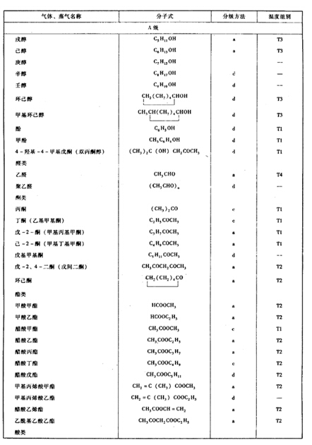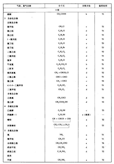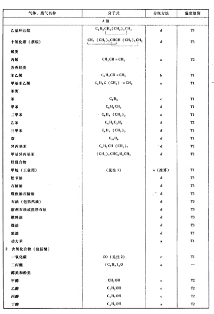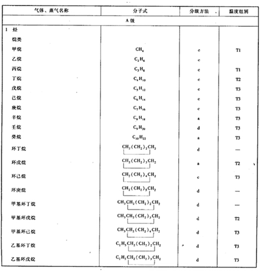 。(biāo)準(zhǔn)的附錄) 檢驗程序1] 采用說明: 1]IEC60079-0中無此附錄。根據(jù)我國具體情況和檢驗工作的需要,按照GB3836.1(第1版)的有關(guān)規(guī)定提出。 A1 各單位按本標(biāo)準(zhǔn)及1.2防爆型式專用標(biāo)準(zhǔn)試制的電氣設(shè)備,均須送國家授權(quán)的質(zhì)量監(jiān)督檢驗部門按相應(yīng)標(biāo)準(zhǔn)的規(guī)定進(jìn)行檢驗。對已取得“防爆合格證”的產(chǎn)品,其他廠生產(chǎn)時,仍須重新履行檢驗程序。 A2 檢驗工作包括技術(shù)文件審查和樣機(jī)檢驗兩項內(nèi)容。 A3 技術(shù)文件審查須送下列資料: a) 產(chǎn)品標(biāo)準(zhǔn)(或技術(shù)條件); b) 與防爆性能有關(guān)的產(chǎn)品圖樣(須簽字完整,并裝訂成冊)。 以上資料各一式二份,審查合格后由檢驗部門蓋章,一份存檢驗部門,一份存送檢單位。 c) 按23.2規(guī)定檢驗單位認(rèn)為確保電氣設(shè)備安全性必要的其他資料。 A4 樣機(jī)檢驗須送下列樣機(jī)及資料: a) 提供符合合格圖樣的完整樣機(jī),其數(shù)量應(yīng)滿足試驗的需要。檢驗部門認(rèn)為必要時,有權(quán)留存樣機(jī); b) 產(chǎn)品使用維護(hù)說明書一式二份,審查合格后由檢驗部門蓋章,一份存檢驗部門,一份存送檢單位; c) 提供檢驗需要的零、部件和必要的拆卸工具; d) 有關(guān)試驗報告: 以上試驗報告和記錄各一份。 e) 有關(guān)的工廠產(chǎn)品質(zhì)量保證文件資料。 A5 樣機(jī)檢驗合格后,由檢驗部門發(fā)給“防爆合格證”,有效期為五年。 A6 取得“防爆合格證”后的產(chǎn)品,當(dāng)進(jìn)行局部更改且涉及相應(yīng)標(biāo)準(zhǔn)的有關(guān)規(guī)定時,須將更改的技術(shù)文件和有關(guān)說明一式二份送原檢驗部門重新檢驗,若更改內(nèi)容不涉及相應(yīng)標(biāo)準(zhǔn)的有關(guān)規(guī)定時,應(yīng)將更改的技術(shù)文件和說明送原檢驗部門備案。 A7 采用新結(jié)構(gòu)、新材料、新技術(shù)制造的電氣設(shè)備,經(jīng)檢驗合格后,發(fā)給“工業(yè)試驗許可證”。取得“工業(yè)試驗許可證”的產(chǎn)品,須經(jīng)工業(yè)試驗(按規(guī)定的時間、地點和臺數(shù)進(jìn)行)。由原檢驗部門根據(jù)所提供的工業(yè)試驗報告、本標(biāo)準(zhǔn)和專用標(biāo)準(zhǔn)的有關(guān)規(guī)定,發(fā)給“防爆合格證”后,方可投入生產(chǎn)。 A8 對于既適用于Ⅰ類又適用于Ⅱ類的電氣設(shè)備,須分別按Ⅰ類和Ⅱ類要求檢驗合格,取得防爆合格證。 A9 檢驗部門有權(quán)對已發(fā)給“防爆合格證”的產(chǎn)品進(jìn)行復(fù)查,如發(fā)現(xiàn)與原檢驗的產(chǎn)品質(zhì)量不符且影響防爆性能時,應(yīng)向制造單位提出意見,必要時撤銷原發(fā)的“防爆合格證”。 注:檢驗部門在”防爆合格證“有效期內(nèi)至少應(yīng)對獲證產(chǎn)品進(jìn)行一次復(fù)查,包括對制造單位產(chǎn)品質(zhì)量保證條件核查。 附錄B 。ㄌ崾镜母戒洠 氣體和蒸氣按其最大試驗安全間隙(MESG) 和最小點燃電流(MIC)分級1] 采用說明: 1]IEC60079-0中該附錄為附錄A。 對”隔爆型“電氣設(shè)備而言,氣體和蒸氣的分級是以最大試驗安全間隙(MESG)為基礎(chǔ),在一個間隙長度為25mm的試驗容器內(nèi)完成的,測定MESG的標(biāo)準(zhǔn)方法是用IEC79-1A文件規(guī)定的試驗容器;關(guān)于只有一個容積為8升的球形容器內(nèi),在間隙附近點火進(jìn)行測定的方法,只有當(dāng)有新規(guī)定的才予以修改。 極限值為: A級 MESG大于0.9mm; B級 MESG0.5mm~0.9mm; C級 MIESG小于0.5mm。 對于本質(zhì)安全型電氣設(shè)備,氣體和蒸氣的分級是以它們的最小點燃電流(MIC)與實驗室用甲烷的最小點燃電流之比為基礎(chǔ)確定的。測定MIC比值的標(biāo)準(zhǔn)方法,必須是采用IEC79-3規(guī)定的“本質(zhì)安全電路的火花試驗裝置”,要用其他儀器測定,只有當(dāng)有新的規(guī)定時才予以變更。 極限值為: A級 MIC比值大于0.8; B級 MIC比值0.45~0.8; C級 MIC比值小于0.45。 大多數(shù)氣體和蒸氣,在兩種測定中只進(jìn)行一種即可列入合適的級別,下列情況下只需進(jìn)行一種測定就可以。 A級 MESG大于0.9mm或MIC比值大于0.9; B級 MESG在0.55~0.9mm之間或MIC比值在0.5~0.8之間; C級 MESG小于0.5mm或MIC比值小于0.45。 在下列情況下既要測定MESG,也要測定MIC比值。 1) 在只測定MIC比值時,其值在0.8~0.9之間。要做出分級,就有必要再測定MESG。 2) 當(dāng)只測定MIC比值時,其值在0.45~0.5之間,要做出分級,就有必要再測定MESG。 3) 當(dāng)測定MESG時,其值在0.5mm~0..55mm之間。要做出分級,就有必要再測定MIC比值。 同一系列的物質(zhì)中某一氣體或蒸氣,可以從這系列分子量較小的另一物質(zhì)的測定結(jié)果中,初步推算出這種氣體或蒸氣屬于那一級。 下面表格中的氣體和蒸氣就是根據(jù)這個基本規(guī)則編制的。 各種氣體或蒸氣附帶的字母意義如下: a) MESG值分級; b) MIC比值分級; c) 既測定MESG,也測定MIC比值; d) 化學(xué)結(jié)構(gòu)相似性分級(初步分級)。 注 1 按體積計,含15%及以下氫氣的所有甲烷混合物都應(yīng)列入“工業(yè)用甲烷”。 2 為了使一氧化碳和空氣混合物在標(biāo)準(zhǔn)環(huán)境溫度下達(dá)到飽和,一氧化碳可以含有足夠的濕度。 未列入表中的氣體可按照MIC和MESG分類,但須注意其特殊性能(例如按照MIC和MESG列入ⅡC類,但它的爆