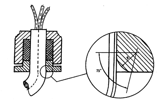 1-密封圈;2-引入裝置;3-壓緊元件;4-電纜;5-填料; 6-密封墊;7-壓緊填料元件 圖D1 電纜引入裝置 ――彈性密封圈; ――金屬或復(fù)合密封圈; ――填料。 電纜密封圈由單一材料或復(fù)合材料制成,其形狀適合所用電纜。 注 1 對密封圈選材時,注意6.1的要求; 2 外殼的防爆型式也取決于電纜內(nèi)部結(jié)構(gòu)。 D2.2材料 D2.2.1 7.3關(guān)于材料靜電電荷的要求適用于電纜引入裝置的外露件。 D2.2.2 彈性密封圈材料應(yīng)符合D3.3型式試驗中的老化試驗。 D2.2.3 填料材料應(yīng)符合第12章規(guī)定的粘接材料的規(guī)定。 D2.3 夾緊 D2.3.1電纜引入裝置應(yīng)能夾緊電纜,防止電纜從引入裝置中被拔脫或扭轉(zhuǎn),這種夾緊作用可通過夾緊裝置、密封圈或填料來實現(xiàn)。任何一種夾緊措施均應(yīng)符合D3有關(guān)的型式試驗要求。對非鎧裝電纜,可通過密封圈或填料來實現(xiàn)。 D2.3.2 Ⅱ類無夾緊裝置的電纜引入裝置,如果將D3規(guī)定降低到25%進(jìn)行夾緊試驗合格,并且文件規(guī)定該裝置僅用在Ⅱ類固定安裝場所,并且用戶保證夾緊電纜,則認(rèn)為該裝置亦可接受。這種裝置應(yīng)加標(biāo)記“×”。 D2.4 電纜引入 D2.4.1電纜引入裝置不應(yīng)有尖銳棱角,以防損傷電纜。 D2.4.2 可彎曲電纜進(jìn)線口應(yīng)有一個至少為75°的圓弧,半徑至少為允許使用電纜最大直徑的四分之一,但不必超過3mm(見圖D2)。