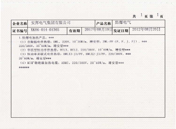 除了這兩種,還有自限溫系列的防爆產(chǎn)品合作證,這里就不一一例舉出來,您需要了解的話,可以直接瀏覽網(wǎng)站的“榮譽資質(zhì)”板塊。另外,提醒廣大的客戶,伴熱帶廠家很多,但是如何識別是否是正規(guī)的廠家,您可以讓對方提供一些資質(zhì),如果不放心,您也可以去相關(guān)的認證網(wǎng)站查詢。